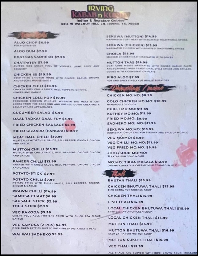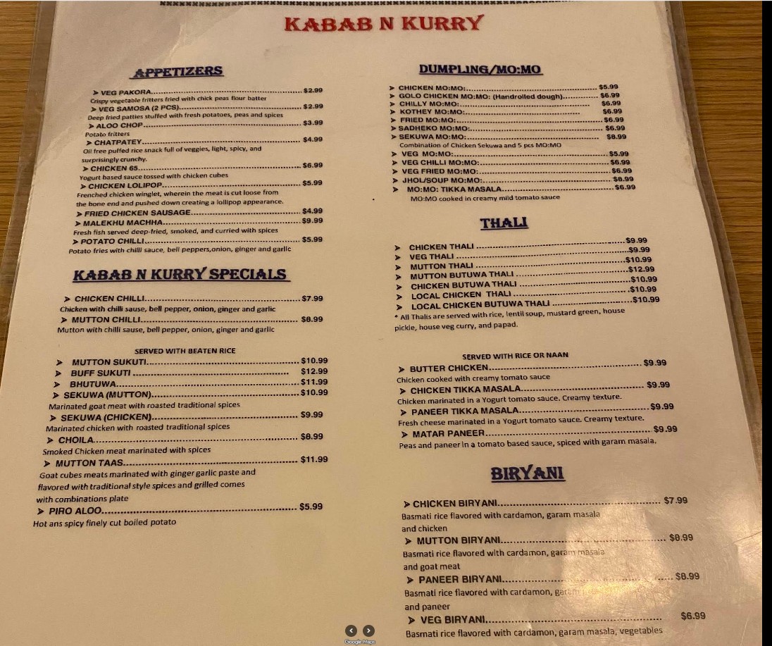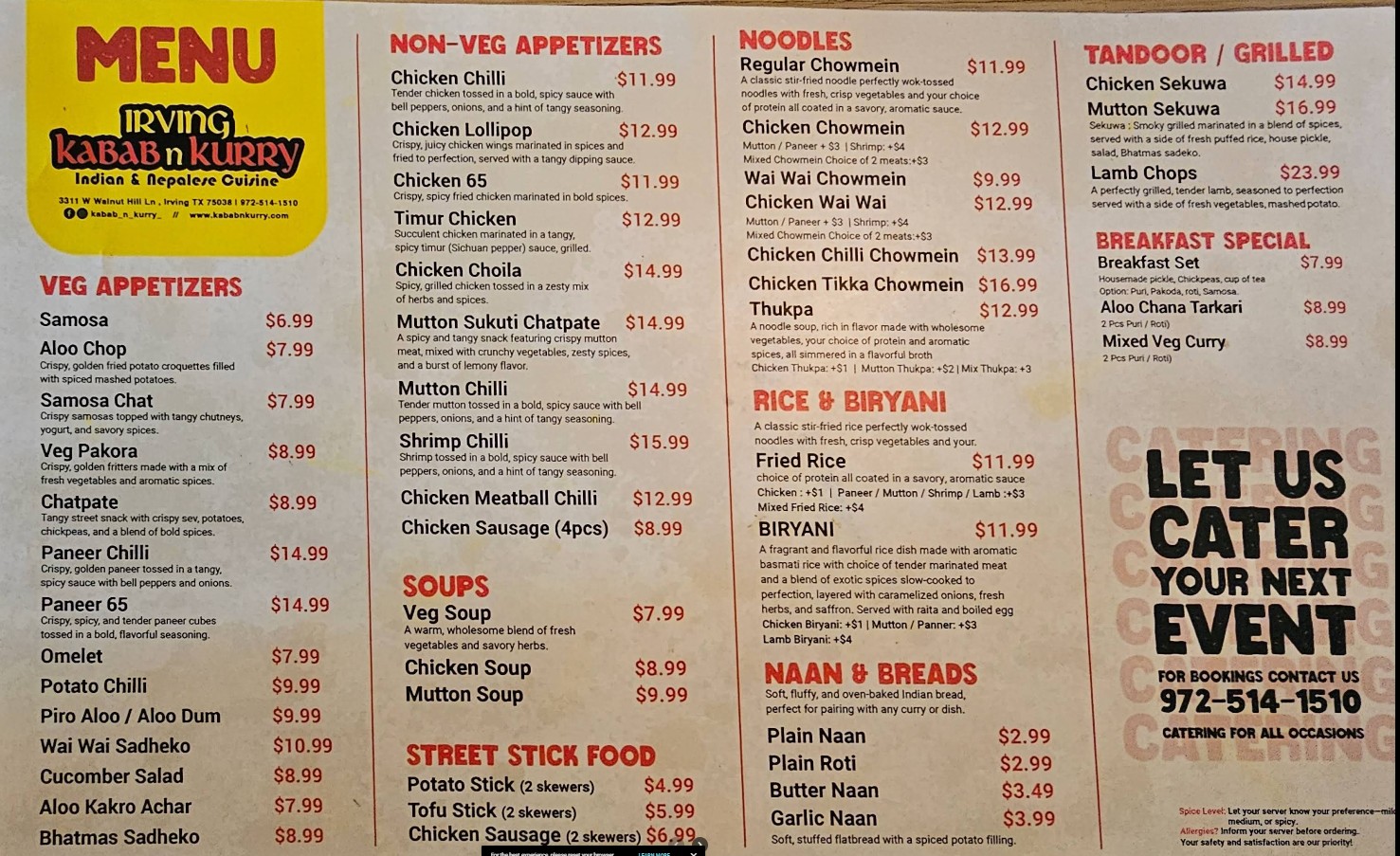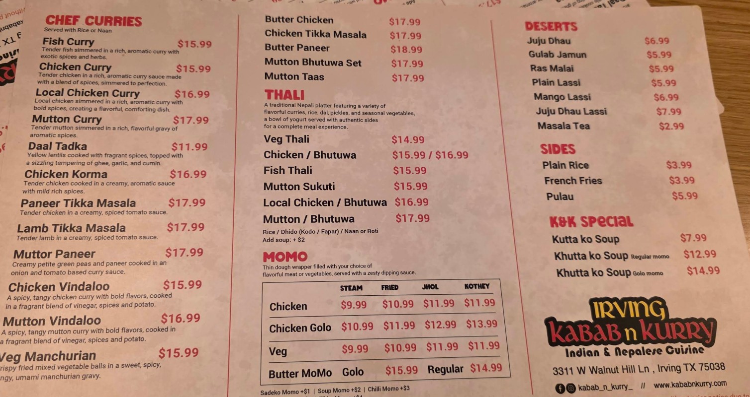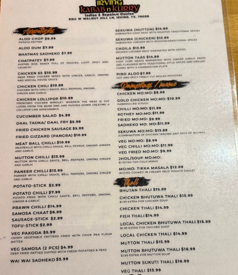 At Restaurant Irving Kabab N Kurry, we proudly bring the rich flavors of Nepalese and Indian cuisine to the heart of Irving, Texas. Our menu is crafted with traditional spices, fresh ingredients, and recipes passed down through generations. Whether you're craving tender kababs, creamy curries, flavorful biryani, spicy momos, or delicious vegetarian and vegan options, every dish is prepared with care to deliver an unforgettable dining experience. Enjoy a warm atmosphere, friendly service, and authentic taste—perfect for families, food lovers, and anyone seeking real South Asian flavor. Dine-in, kerbside pickup, and delivery are all available for your convenience.